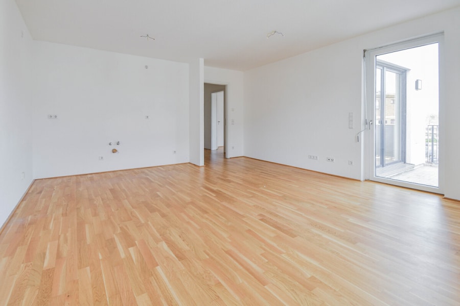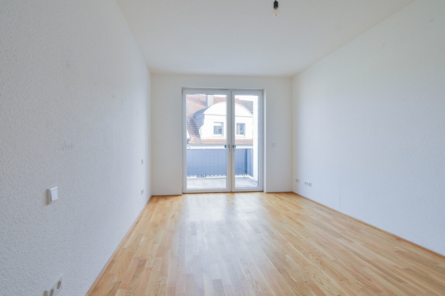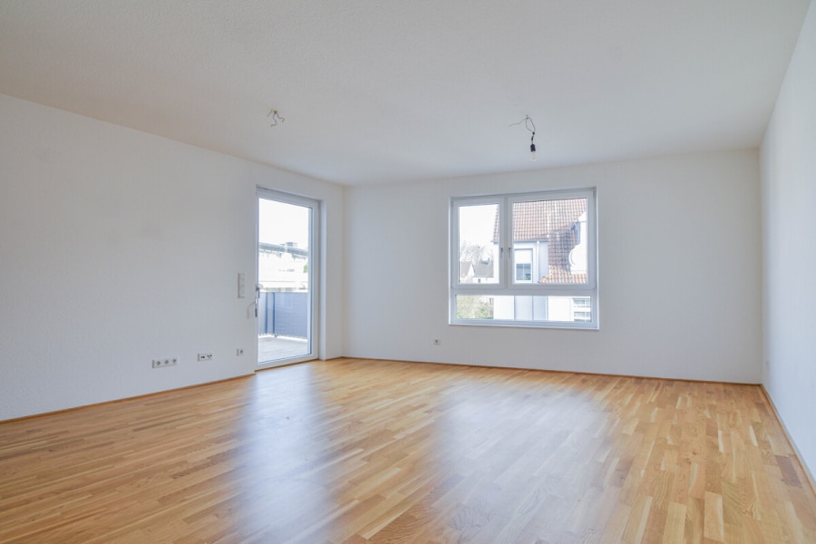 Die Wohnfläche von ca. 56 m² verteilt sich auf eine Diele, ein innenliegendes Badezimmer mit bodengleicher Dusche und Anschlüssen für Waschmaschine und Trockner, einen lichtdurchfluteten, offenen Wohn-/Essbereich mit Zugang zum Balkon sowie ein geräumiges Schlafzimmer, ebenfalls mit Zugang zum Balkon.