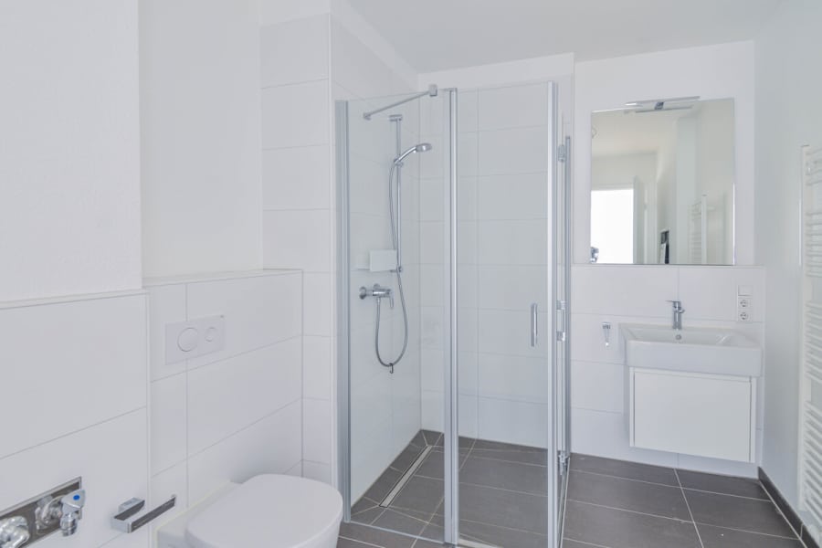 - Großformatige Boden- und Wandfliesen im Badezimmer